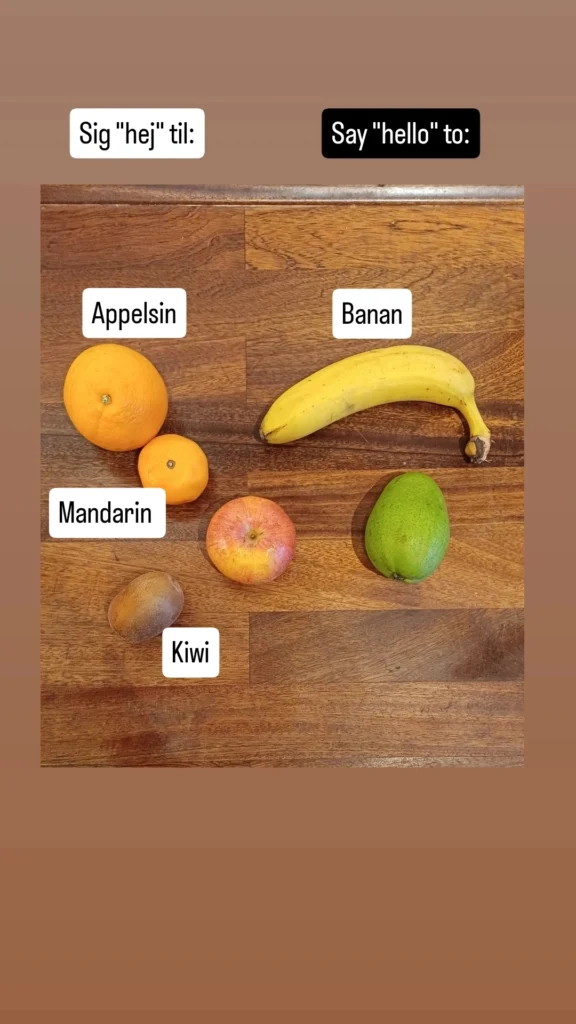 Ondertussen deed ik op Instagram een quizje waarbij je kon gokken hoe bepaalde vruchten heten. Dat werd een interactief en informatief dagje! Weet jij aanvullend op de foto hoe je een appel en een peer noemt in het Deens?