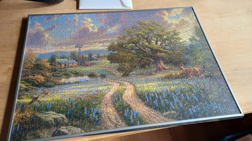 Overigens was dat wel weer zo’n moment waarop ik mij besef hoe ongelooflijk blij ik word van puzzelen en dat ik dat echt vaker mag doen ter ontspanning. Aangezien een puzzel ruimte in beslag neemt, voel ik me soms wat bezwaard om te gaan puzzelen. Gelukkig hebben we een grote eettafel, dus als we geen bezoek verwachten, is er niksss aan het handje.