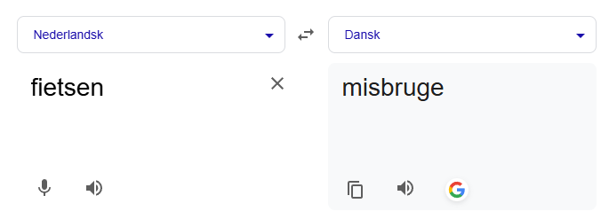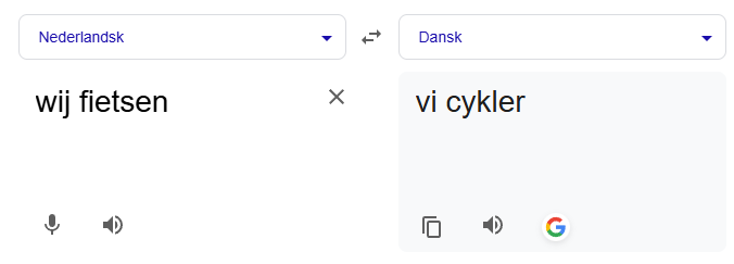 We nemen een voorbeeld. Ik laat de tekst ‘wij fietsen’ vertalen door Google. Dat gaat goed, want er komt ‘vi cykler’ te staan.