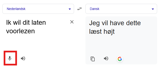 In dezelfde categorie kun je het óók gebruiken om een tekst in te spreken. Zo kun je ontdekken of je uitspraak goed te verstaan is. Daarvoor wissel je van taal (je invoertaal wordt Deens en dan vertaal je het naar elke gewenste taal) en klik je op het microfoontje (in het screenshot rood gekaderd):
