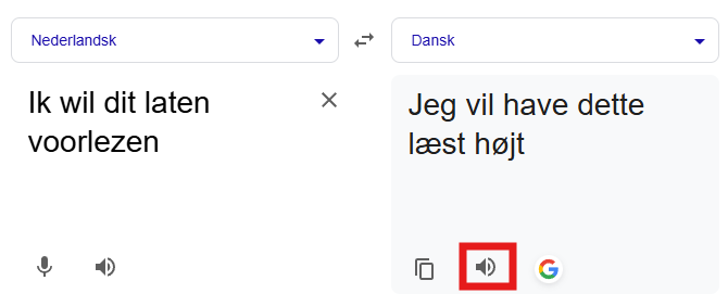 Waar is Google Translate dan wel goed in? Voorlezen! Bij zowel de tekst die je zelf invoert als de vertaalde tekst, staat een luidsprekersymbool (zie het screenshot hieronder, met een rood kadertje). Als je hierop klikt, wordt je tekst hardop uitgesproken. En ja: dat werkt best goed! Ook experts in Denemarken zijn hier best over te spreken.